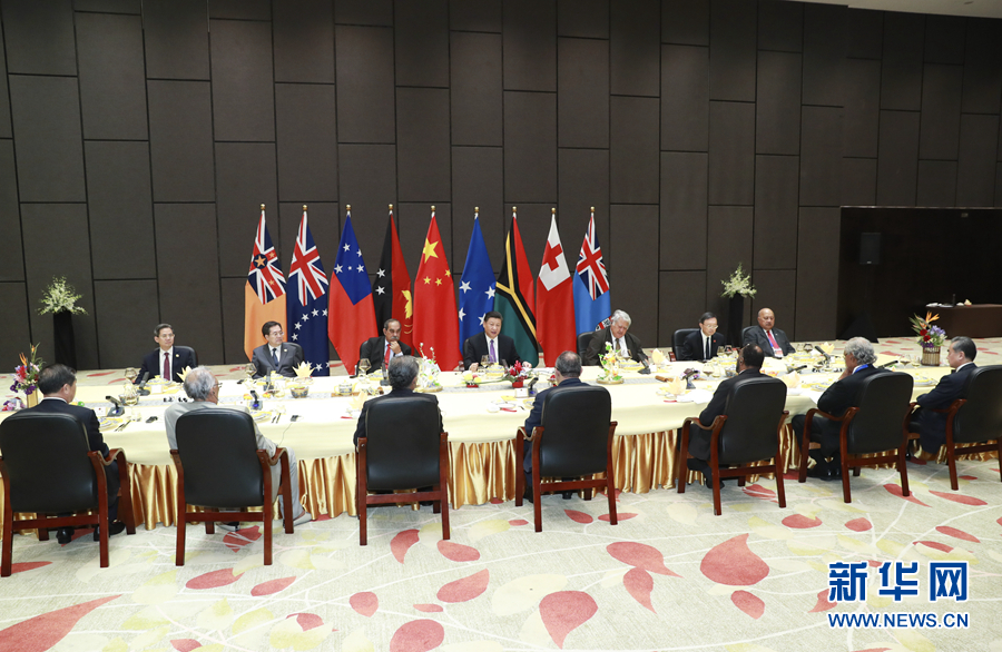 11月16日,国家主席习近平在莫尔兹比港同巴布亚新几内亚总理奥尼尔、密克罗尼西亚联邦总统克里斯琴、萨摩亚总理图伊拉埃帕、瓦努阿图总理萨尔瓦伊、库克群岛总理普纳、汤加首相波希瓦、纽埃总理塔拉吉等建交太平洋岛国领导人以及斐济政府代表、国防部长昆布安博拉举行集体会晤。习近平主持会晤并发表主旨讲话。 新华社记者 庞兴雷 摄