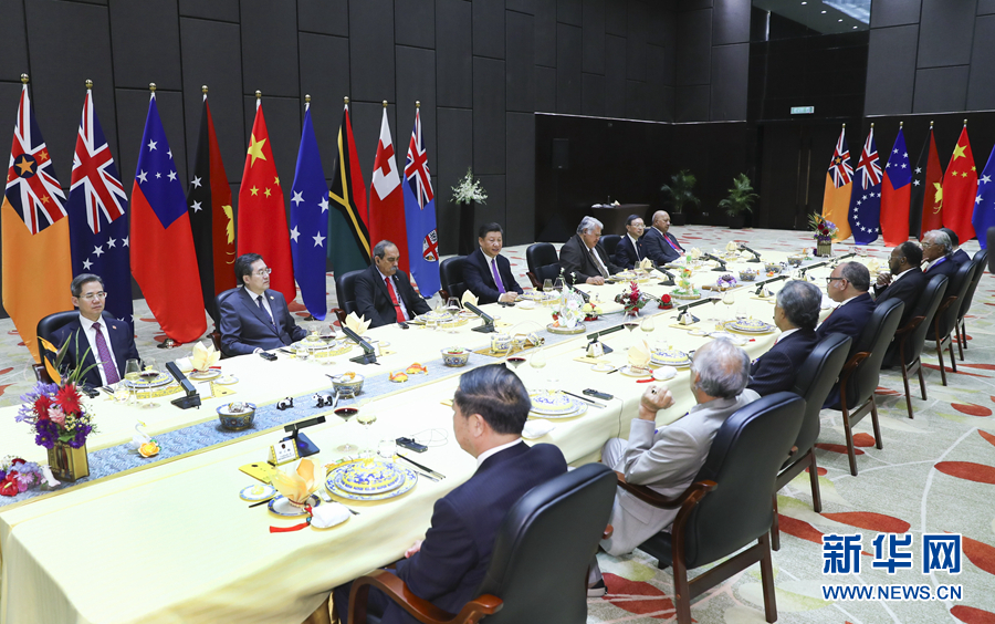 11月16日,国家主席习近平在莫尔兹比港同巴布亚新几内亚总理奥尼尔、密克罗尼西亚联邦总统克里斯琴、萨摩亚总理图伊拉埃帕、瓦努阿图总理萨尔瓦伊、库克群岛总理普纳、汤加首相波希瓦、纽埃总理塔拉吉等建交太平洋岛国领导人以及斐济政府代表、国防部长昆布安博拉举行集体会晤。习近平主持会晤并发表主旨讲话。 新华社记者 谢环驰 摄