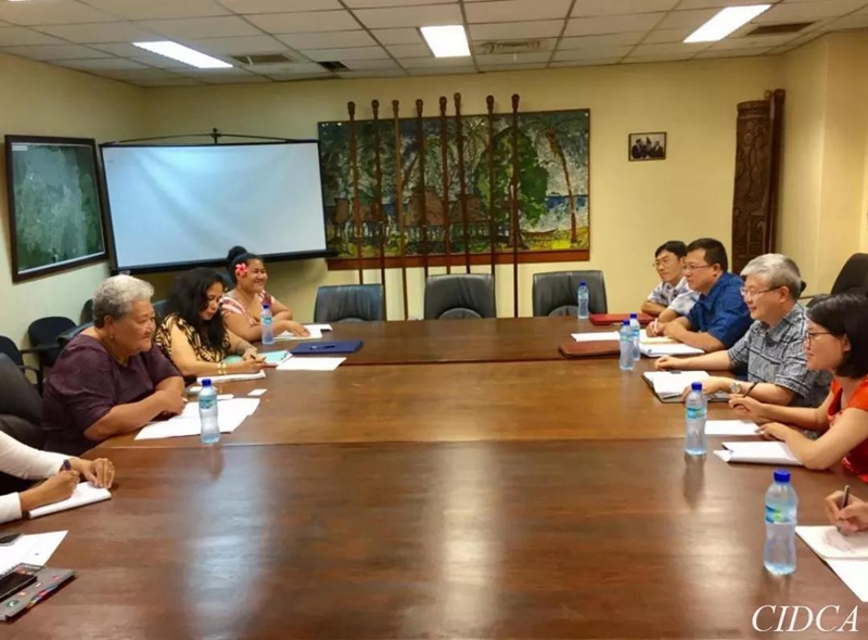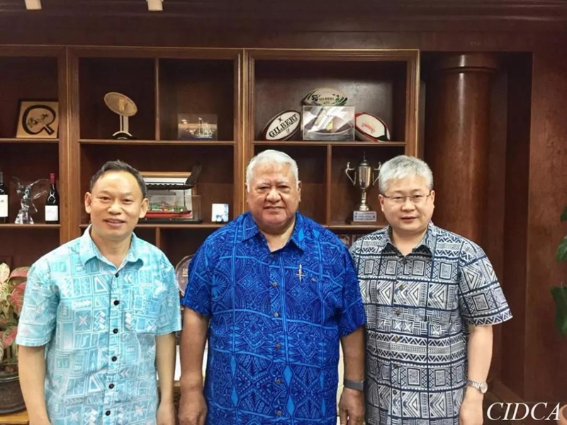 国家国际发展合作署副署长周柳军(右)拜会萨摩亚总理图伊拉埃帕(中),左为中国驻萨摩亚大使巢小良