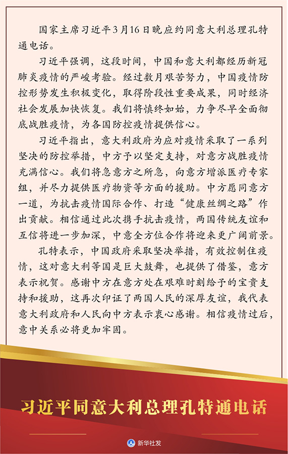 习近平指出,意大利政府为应对疫情采取了一系列坚决的防控举措,中方予以坚定支持,对意方战胜疫情充满信心。我们将急意方之所急,向意方增派医疗专家组,并尽力提供医疗物资等方面的援助。中方愿同意方一道,为抗击疫情国际合作、打造“健康丝绸之路”作出贡献。相信通过此次携手抗击疫情,两国传统友谊和互信将进一步加深,中意全方位合作将迎来更广阔前景。