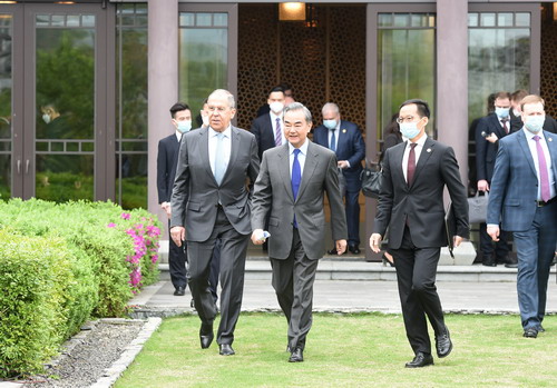 2021年3月23日,国务委员兼外长王毅在广西桂林同俄罗斯外长拉夫罗夫会谈后共同会见记者。