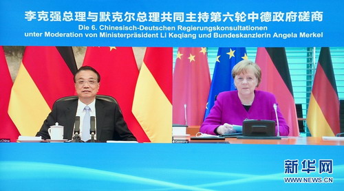 2021年4月28日下午,国务院总理李克强在人民大会堂以视频形式与德国总理默克尔共同主持第六轮中德政府磋商。