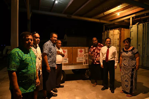 2021年9月1日凌晨,中国政府援助基里巴斯的首批新冠疫苗通过包机运抵基首都塔拉瓦。中国驻基大使唐松根、基卫生和医疗服务部长伊森特昂、议会卫生委员会全体议员前往机场迎接并出席交接仪式。