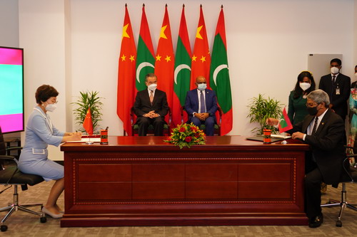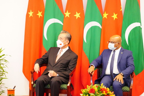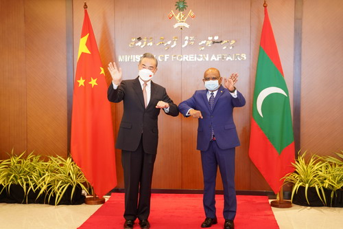 当地时间2022年1月8日,国务委员兼外长王毅在马累同马尔代夫外长沙希德举行会谈。