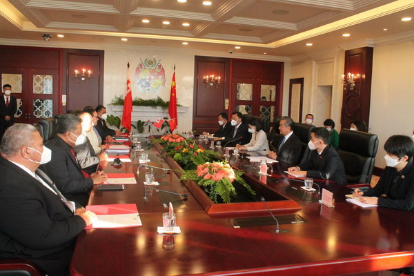 胡阿卡瓦梅利库表示,很高兴在中方援建的政府大楼接待中国代表团。你们克服疫情、不远万里到访汤加,充分印证了汤中关系的友好且强劲。建交以来,汤中两国关系日益紧密,互利合作持续推进。衷心感谢中方对汤加经济社会发展提供的无私帮助,特别是第一时间紧急驰援汤加应对火山海啸灾害并有力支持汤加抗击新冠疫情。汤中都坚持不干涉内政、尊重主权原则,汤加将继续坚定奉行一个中国政策,坚定致力于增进汤中友好,期待同中方加强共建“一带一路”对接,深化各领域务实合作。