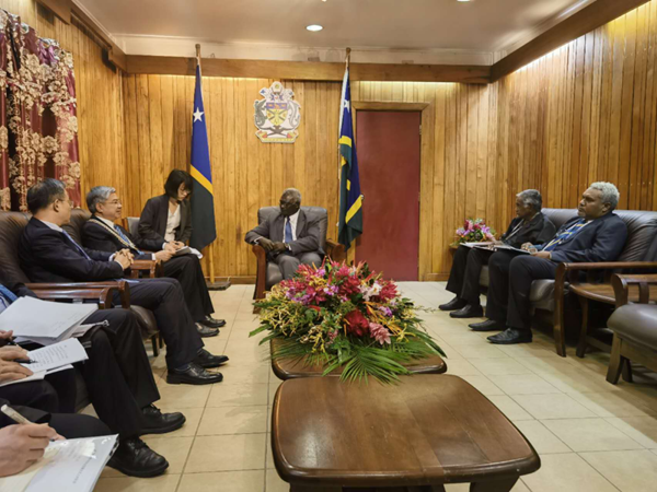 当地时间3月20日上午,国家国际发展合作署副署长唐文弘在所罗门群岛访问期间,拜会所总理梅纳西·索加瓦雷。中国驻所罗门群岛大使李明、经商参赞宫瑞、国合署地区二司副司长张黎华,所总理特别助理卡布伊等参加会见。