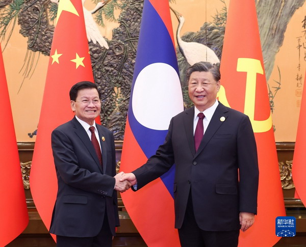 2023年10月20日上午,中共中央总书记、国家主席习近平在人民大会堂会见来华出席第三届“一带一路”国际合作高峰论坛并进行工作访问的老挝人民革命党中央总书记、国家主席通伦。