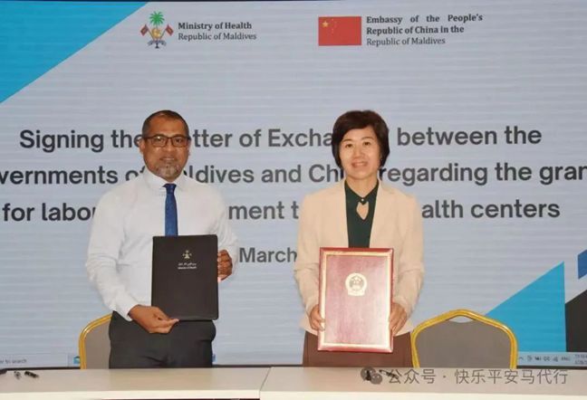 2024年3月28日,中国驻马尔代夫大使王立新与马卫生部部长卡利尔分别代表中马双方签署了援马尔代夫医院实验室设备项目立项换文。项目由国家国际发展合作署立项。中国驻马使馆,马卫生部、外交部官员共同出席签字仪式。