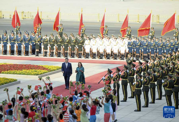 博鲁阿尔特抵达时,礼兵列队致敬。两国元首登上检阅台,军乐团奏中秘两国国歌,天安门广场鸣放21响礼炮。博鲁阿尔特在习近平陪同下检阅中国人民解放军仪仗队,并观看分列式。