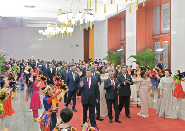 出席论坛峰会的51个非洲国家元首、政府首脑及配偶,2位总统代表,非盟委员会主席和联合国秘书长等贵宾陆续抵达人民大会堂。习近平和彭丽媛热情迎接,同他们分别握手问候,并集体合影留念。