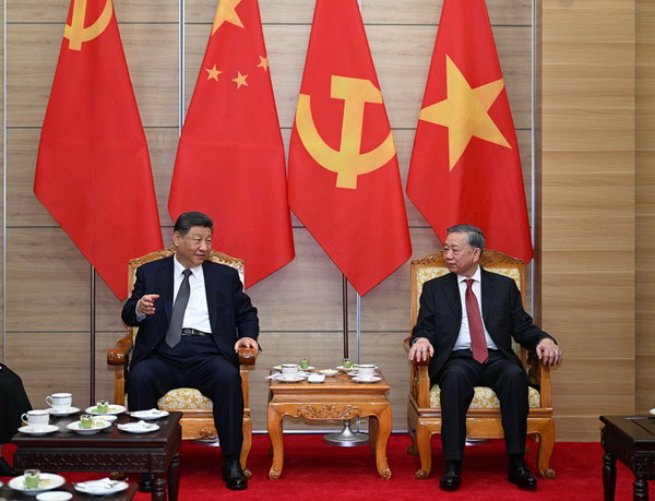 当地时间2025年4月15日上午,在即将结束对越南进行国事访问之际,中共中央总书记、国家主席习近平同越共中央总书记苏林话别。