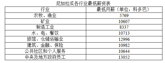 首都马那瓜办公楼租金约12~17.6美元/平方米/月。尼加拉瓜政府对外籍劳务控制严格,外资企业如需雇用外籍员工,必须向劳工部提出申请。尼加拉瓜劳工部每年年初公布当年最低薪资,各行业必须按该标准执行。截至2024年6月,尼加拉瓜各行业最低月薪如下表所示。