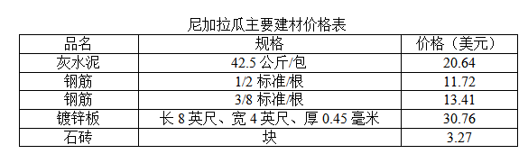 尼加拉瓜国内市场水泥、钢材等主要建材供应情况良好。尼加拉瓜主要建材价格如下表所示。